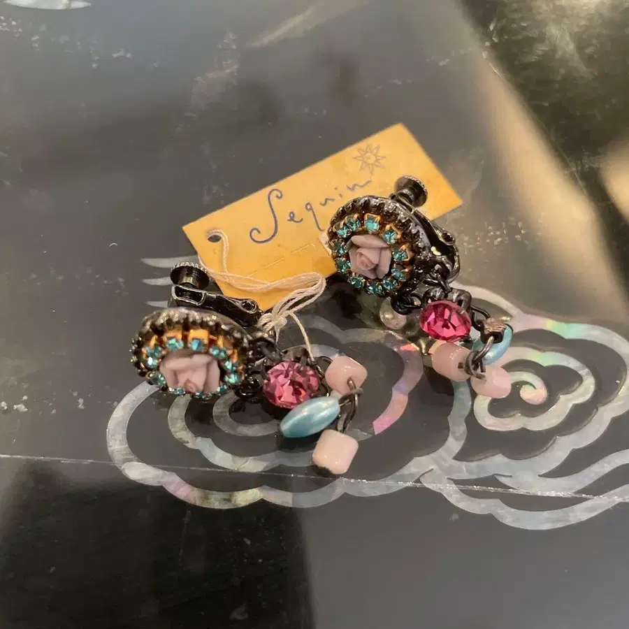 플라워 모티브의 클립식 귀걸이, 컬러풀한 스톤과 비즈가 특징. - 색상: 블랙, 핑크, 블루 - 소재: 금속, 비즈 - 스타일: 클립식 귀걸이 - 장식: 스톤, 비즈 - 디자인: 플라워 모티브 방문해 주셔서 감사합니다.