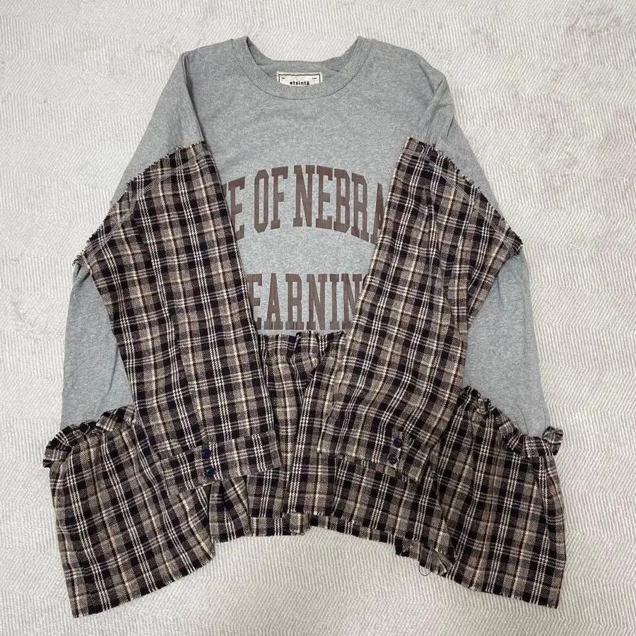 그레이 색상의 긴팔 티셔츠에 체크 무늬 프릴이 특징적인 디자인입니다. - 브랜드: etsintä - 디자인: 그레이 색상의 긴팔 티셔츠와 체크 무늬 프릴 디자인 - 텍스트: STATE OF NEBRASKA LEARNING - 소재: 코튼 혼방 2025년 12월 구매 1회 착용 방문해 주셔서 감사합니다.