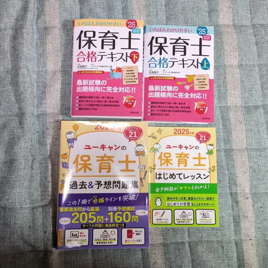 2025년판 보육사 합격 텍스트 상(빨간색 시트 포함) 2025년판 보육사 합격 텍스트 하(빨간색 시트 포함) 2025년판 유캠프 보육사 첫 레슨 2025년판 유캠프 보육사 과거 & 예상 문제집 위 4권 묶음 판매입니다. 필기, 찢김 등의 큰 데미지는 없습니다.