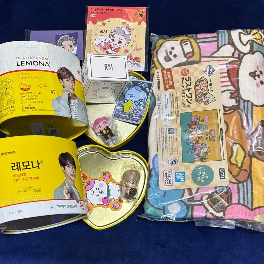 방문해 주셔서 감사합니다!! JIN과 RM 디자인의 레모나 캔과 캐릭터 굿즈 세트. - 상품명: 레모나 (Lemonade) 캔 - 캐릭터: JIN, RM - 디자인: 하트형 캔 - 내용물: JIN 굿즈, RM 굿즈 - 타월: 캐릭터 타월 사진 2장과 3장을 추가했습니다. 즉시 구매 ⭕️