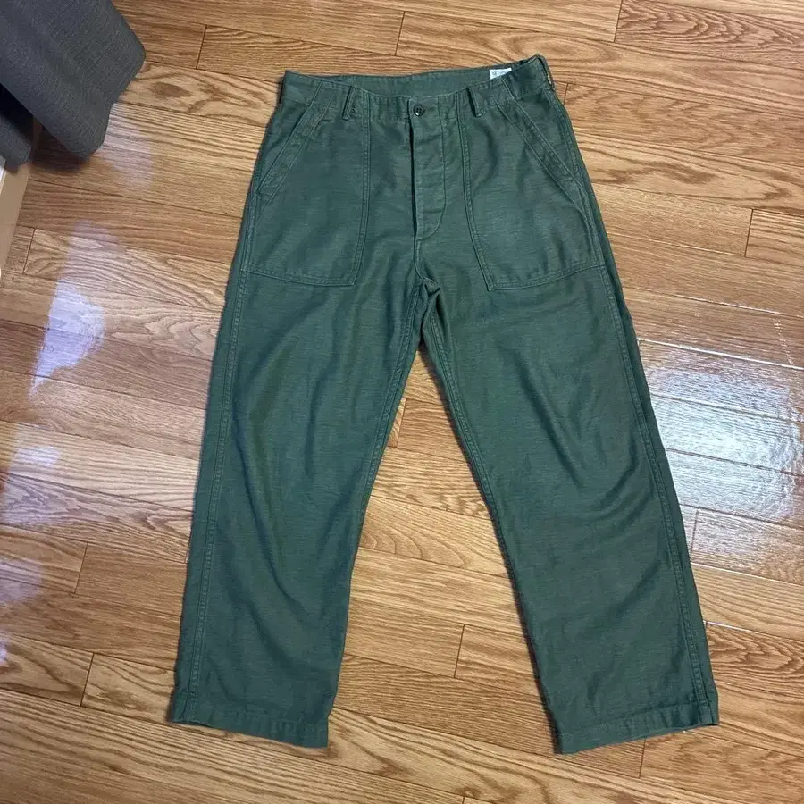 올리브 그린 워크 팬츠, 플랩이 달린 백 포켓 있음.