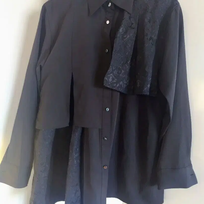 기장 70 어깨 너비 46 가슴둘레 104 소매 길이 55 목둘레 32 레이스 디테일이 특징적인 블랙 셔츠.