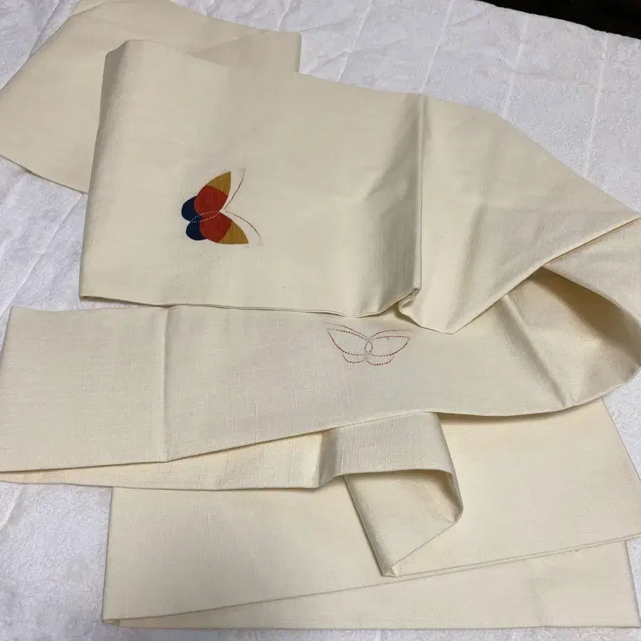 크림색 나고야 오비에 나비 그림이 있습니다. 나비는 프린트된 그림과 자수가 있습니다. - 디자인: 나비 - 색상: 크림색 마지막 사진처럼 컴팩트하게 접어서 보내드립니다. 방문해 주셔서 감사합니다.