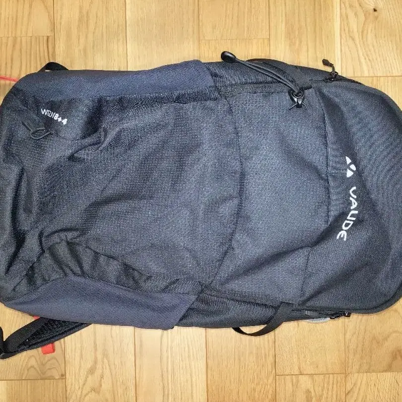 메쉬 뒷면 패드와 칸막이가 있는 내부 포켓이 있는 VAUDE의 다크 그레이 백팩.