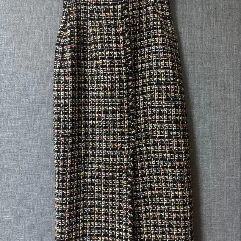 구매 후 가지고 있던 의류와 잘 맞지 않아 거의 입지 못했기 때문에, 눈에 띄는 얼룩이나 올풀림은 없습니다. 트위드 소재의 타이트 스커트입니다. 허리와 밑단의 프린지가 귀엽습니다.