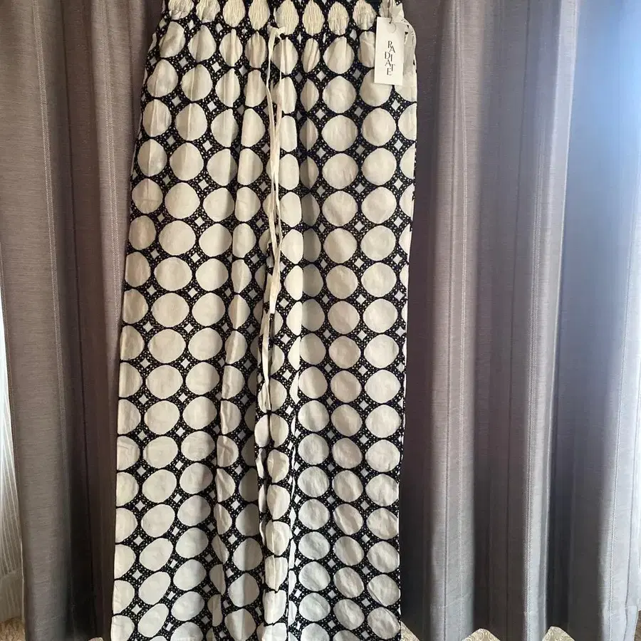 화이트 베이스에 블랙 원형 무늬가 들어간 코튼 소재의 와이드 팬츠. - 브랜드: RADIATE - 사이즈: 38 - 소재: 코튼 100% - 디자인: 화이트 베이스에 블랙 원형 무늬 - 원산국: 인도 정가 22,000엔 방문해 주셔서 감사합니다. 사이즈 - M