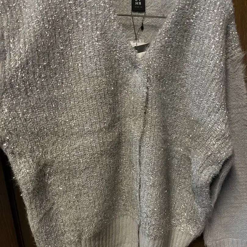 ETHR의 라메 블루 그레이 긴팔 가디건, V넥 디자인