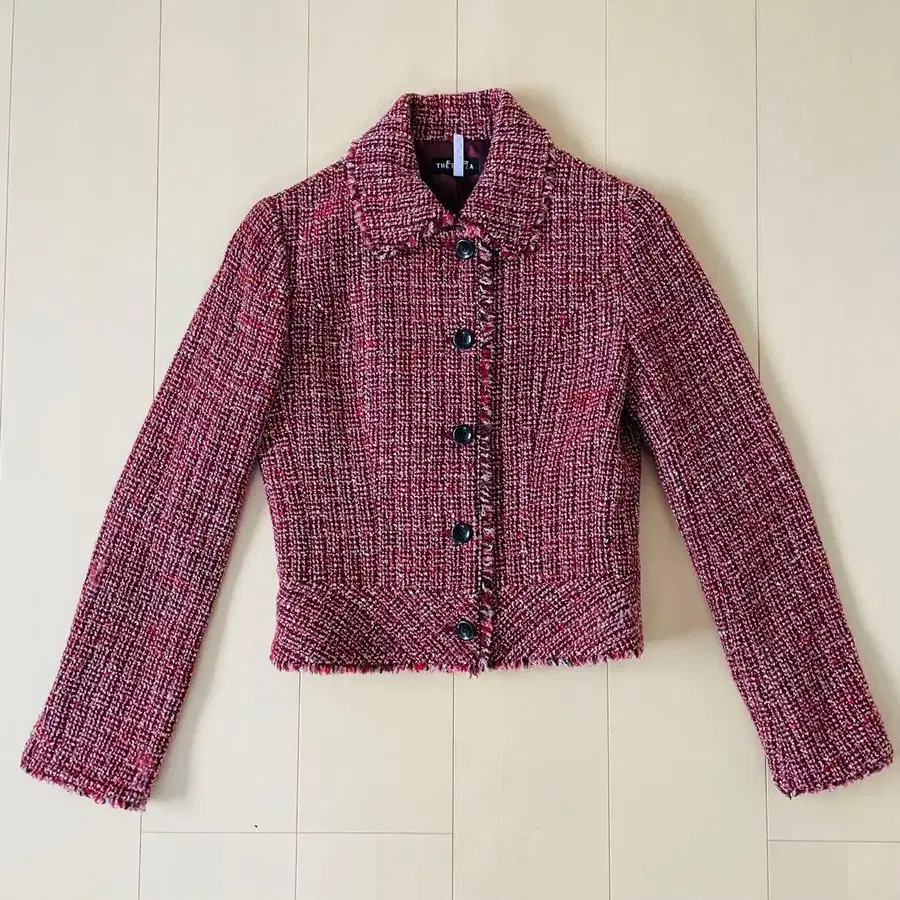 • 테일러드 자켓 트위드 펄 버튼 레트로 빨간색 블랙 L