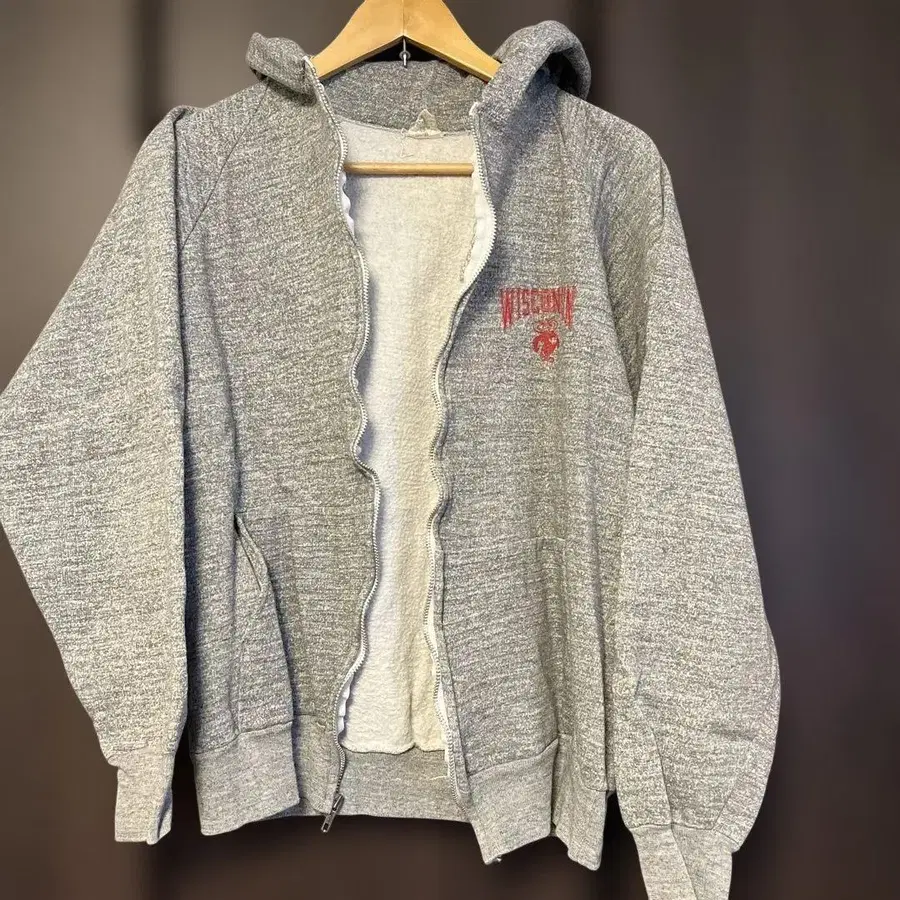 80s 90s US 구제 의류 위스콘신 로고 지퍼 후드티 멜란지 그레이