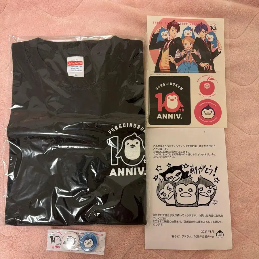 빙글빙글 티키타키 클라우드 펀딩의 답례품입니다. 10주년을 축하하는 특별한 디자인의 블랙 티셔츠와 부속품 세트. - 색상: 블랙 - 기념품: 10주년 기념 티셔츠 - 부속품: 스티커, 메시지 카드, 캔뱃지