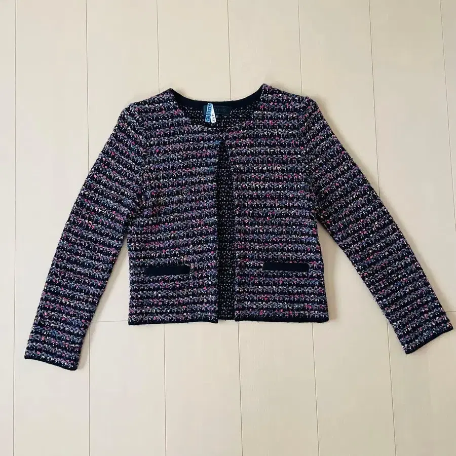 블랙과 핑크 트위드 소재의 노카라 숏 기장 자켓. - 색상: 블랙과 핑크 트위드 - 디자인: 노카라, 숏 기장 - 포켓: 프론트에 장식적인 포켓 - 소재: 트위드 소재 - 소매: 긴팔 방문해 주셔서 감사합니다. 어깨 너비/가슴 너비/소매 길이/기장 소매 길이 - 56cm 기장 - 45cm 계절감 - 가을, 겨울 얼룩, 찢김, 냄새 등 - 없음 사이즈 - 2호