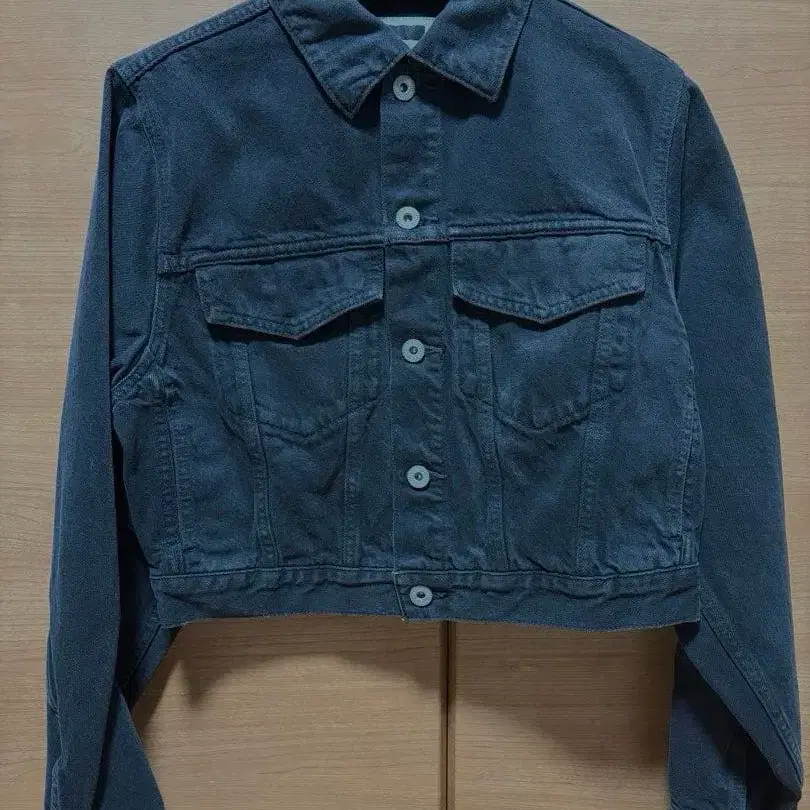 블랙 데님 크롭 자켓, 프론트 버튼과 포켓이 있습니다.