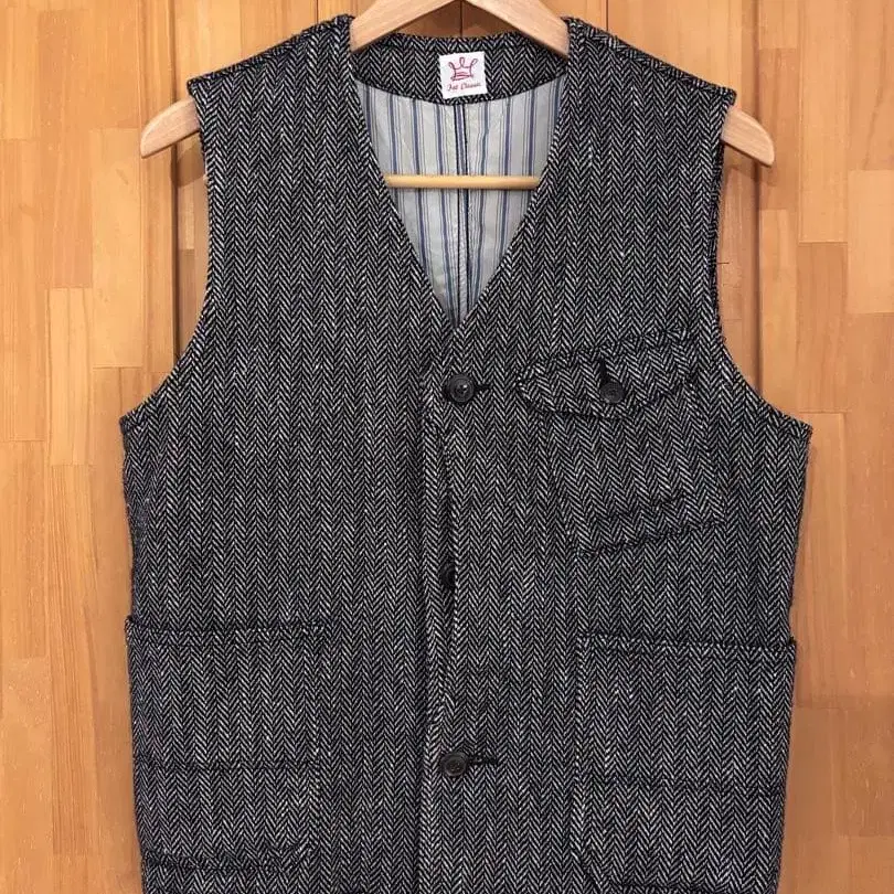 헤링본 패턴의 블랙/화이트 베스트, 프론트 포켓 부착에 스트라이프 패턴 안감. - 브랜드: Fat Classic - 색상: 블랙/화이트 - 디자인: 헤링본 패턴 - 포켓: 프론트 포켓 있음 - 안쪽 디자인: 스트라이프 패턴 안감 방문해 주셔서 감사합니다.