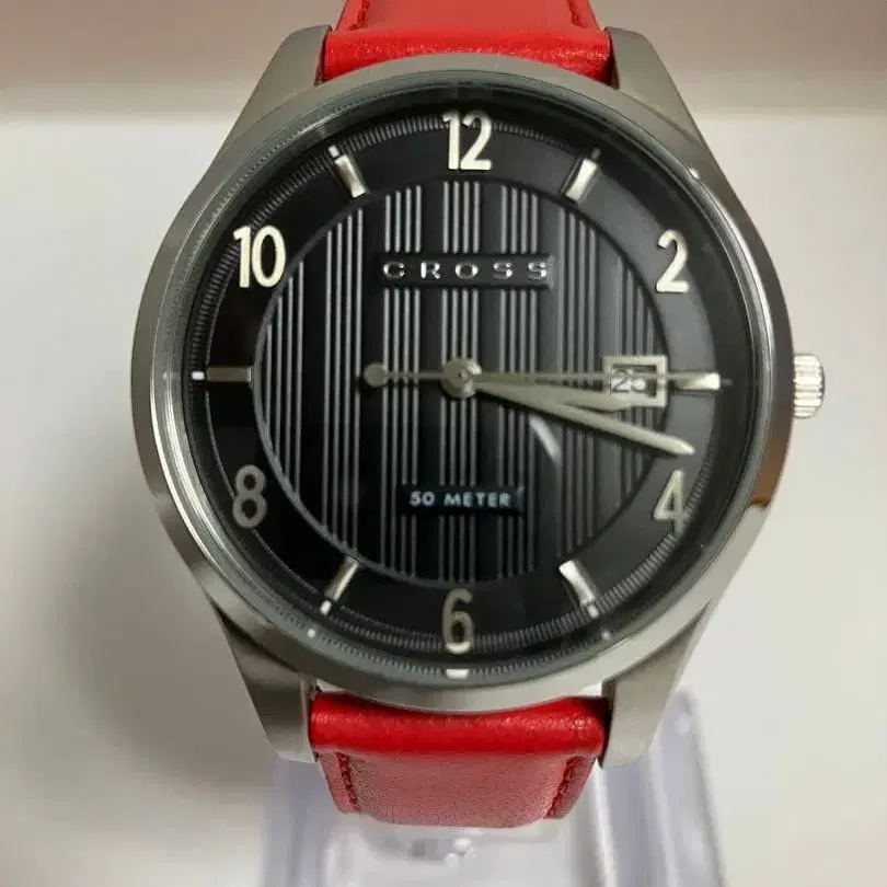 블랙 다이얼과 레드 가죽의 대비가 매력적인 아날로그 쿼츠 손목시계.