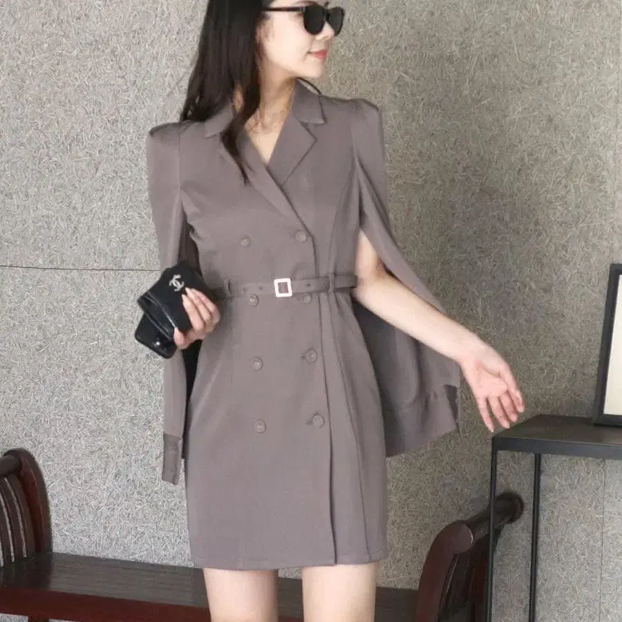 • RANDA 베이지 케이프 디자인 미니 원피스