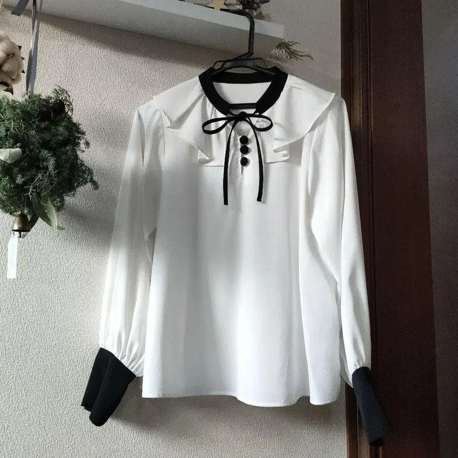 프릴이 달린 옷깃과 리본이 특징인 화이트 블라우스.