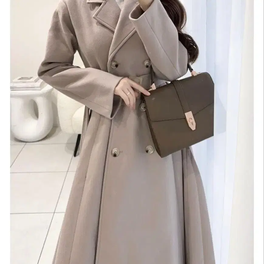 테라스 롱 코트 더블 브레스트 허리 벨트 포함