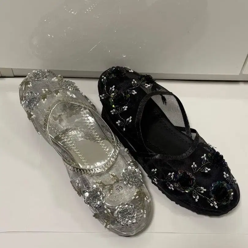 실버와 블랙 색상의 꽃 자수가 놓인 베트남 샌들입니다.