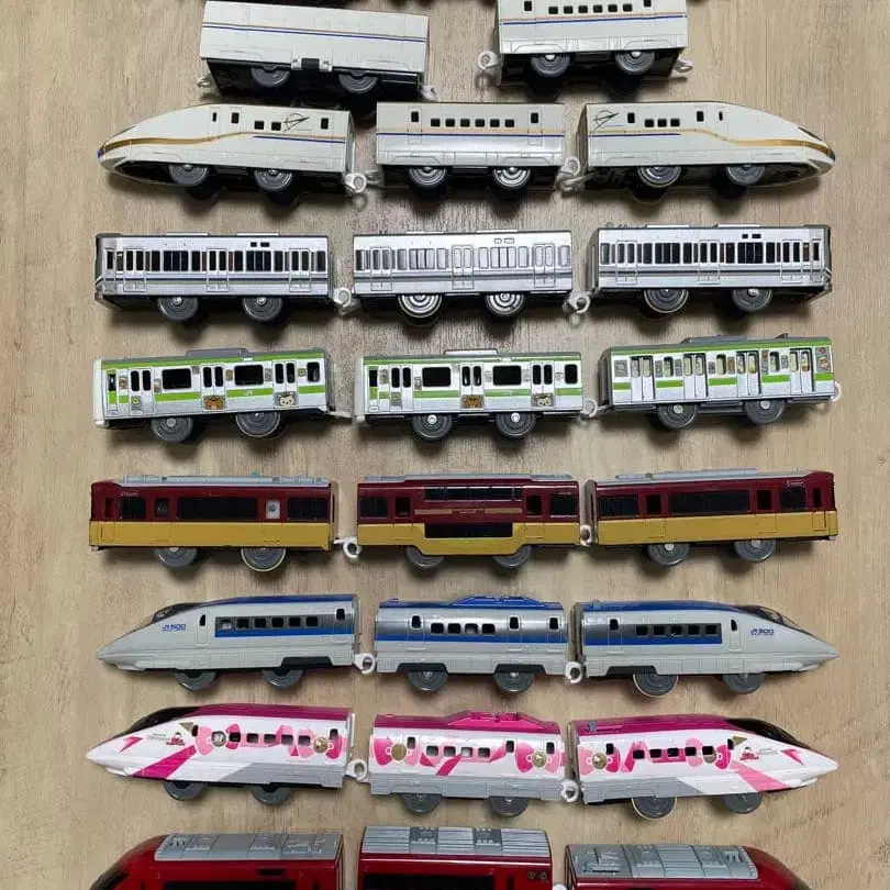 어린이가 가지고 놀던 물건이라 흠집과 얼룩이 있으니 이해 부탁드립니다. 낱개 판매는 하지 않습니다. 1 후지큐코 8500계 후지산 뷰 특급 2 헬로키티 신칸센 3 라이트 부착 500계 신칸센 4 게이한 전철 8000계 5 리락쿠마 x 야마노테선 랩핑 기차 6 사운드 225계 신쾌속 7 E7계 카가야키 8 다이소 C11형 증기기관차 7번은 작동하지 않았습니다. 그 외에는 작동 확인을 했지만 움직이는 정도라고 생각해주세요. 방문해 주셔서 감사합니다. 차량 종류 - 기차