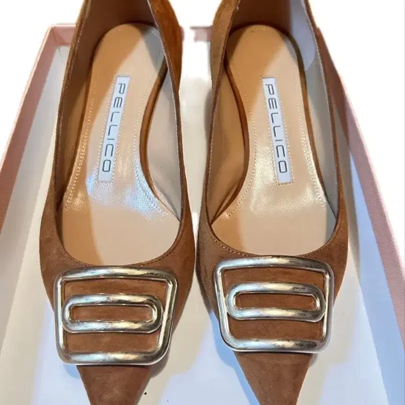 브라운 스웨이드 소재에 메탈 버클이 특징인 하이힐입니다.