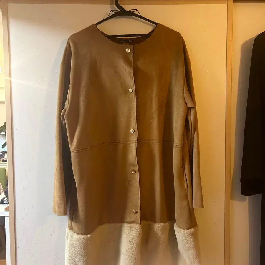스웨이드풍 베이지 롱 코트, 퍼풍 하단이 특징. - 브랜드: ZARA - 색상: 베이지 - 스타일: 롱 코트 - 소재: 스웨이드풍 - 디자인: 버튼 포함 - 하단: 퍼풍 방문해 주셔서 감사합니다. 사이즈 - L