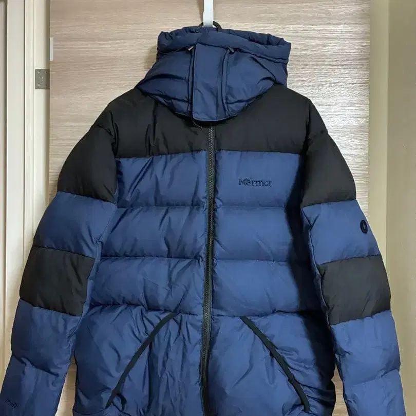 Marmot의 네이비와 블랙 다운 자켓, 로고 자수가 있어 스타일리시한 디자인입니다.