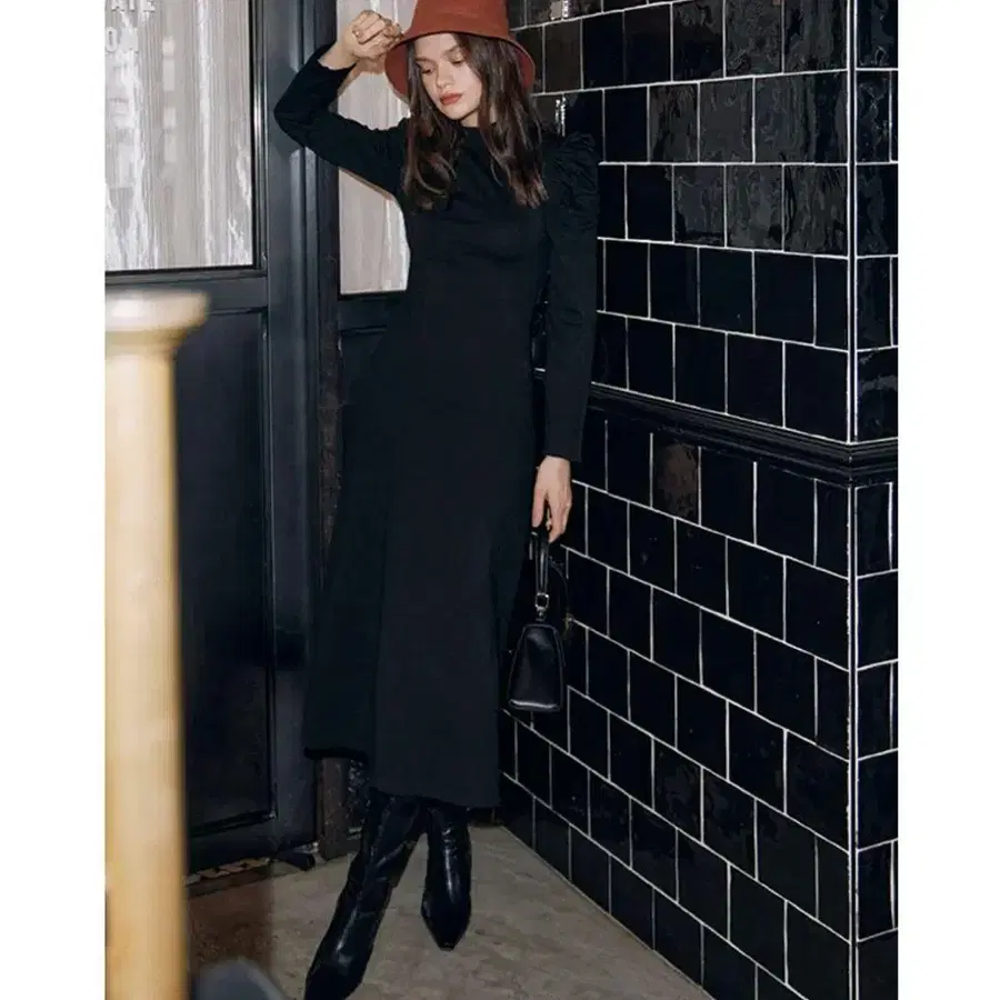 블랙 리브 벌룬 슬리브 원피스