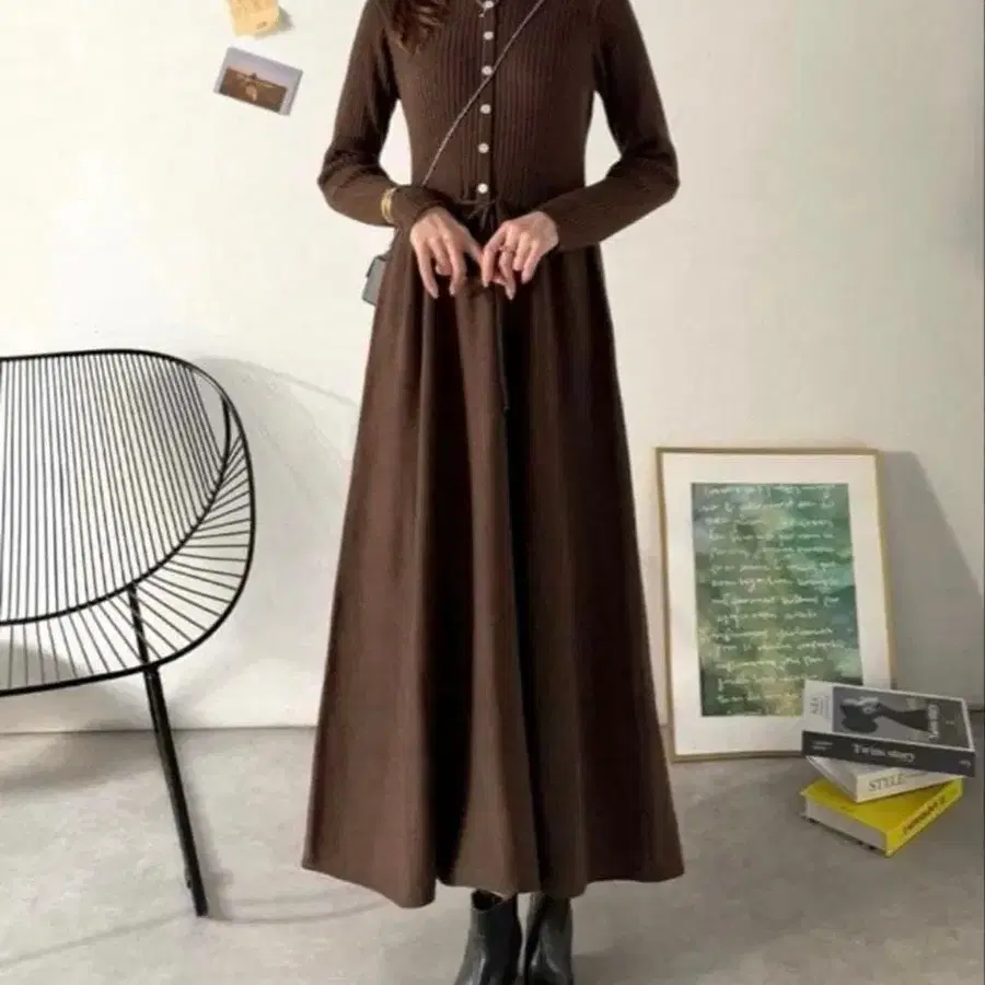 Classical Elf 허리 리본 니트 원피스 (롱 기장)