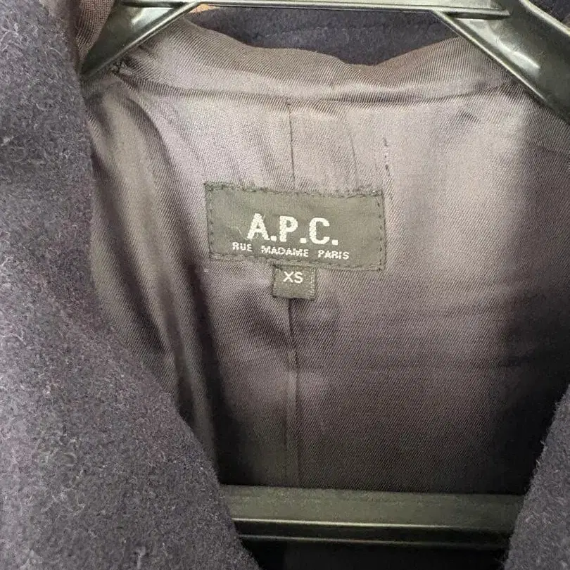네이비 A.P.C. 더플 코트, 후드 부착, XS 사이즈. 질리지 않는 디자인입니다. 이너로 충전솜 슬리브리스 등을 입으면 딱 좋습니다!