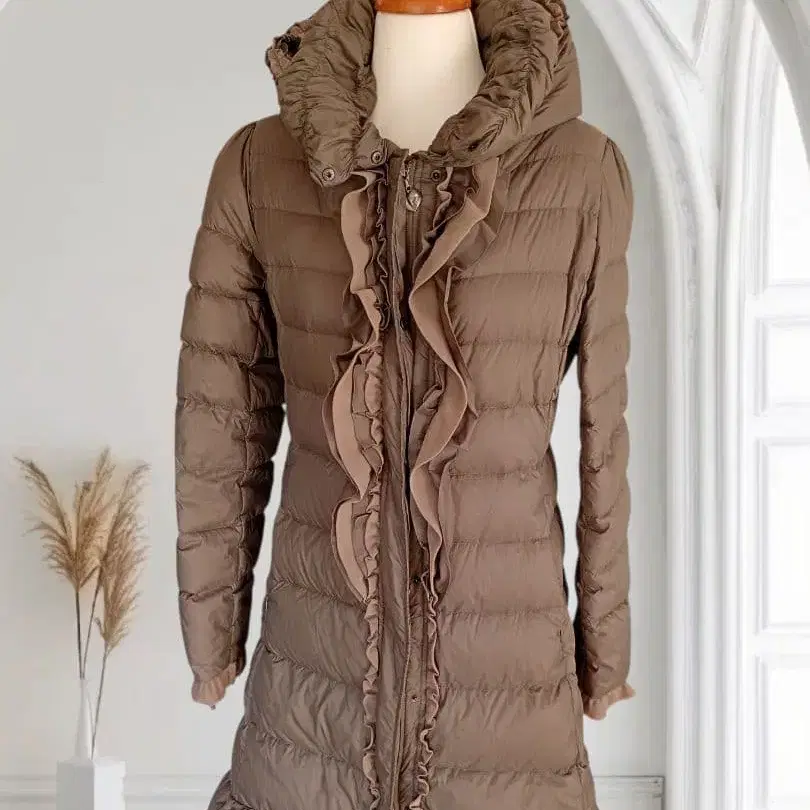 프릴 후드 디자인의 롱 기장 브라운 다운 자켓.