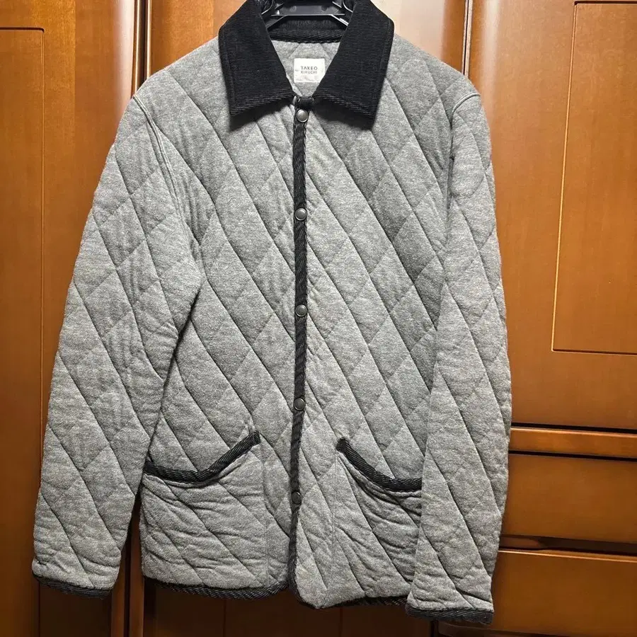 자동 번역되었어요. 원문보기그레이 색상의 퀼팅 자켓, 코듀로이 옷깃 부착, TAKEO KIKUCHI 제품.
