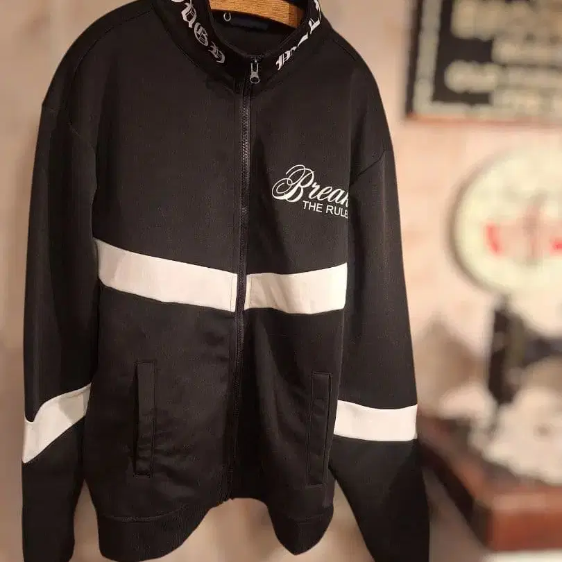 지퍼가 달린 캐주얼 저리, 화이트 스트라이프와 텍스트 디자인이 특징. - 색상: 블랙 - 디자인: 지퍼, 화이트 스트라이프 - 텍스트: Break the Rules - 컬러 악센트: 화이트 스트라이프와 넥 부분의 텍스트 - 스타일: 캐주얼 방문해 주셔서 감사합니다.