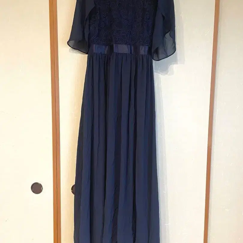 네이비 레이스 장식 플레어 슬리브 드레스