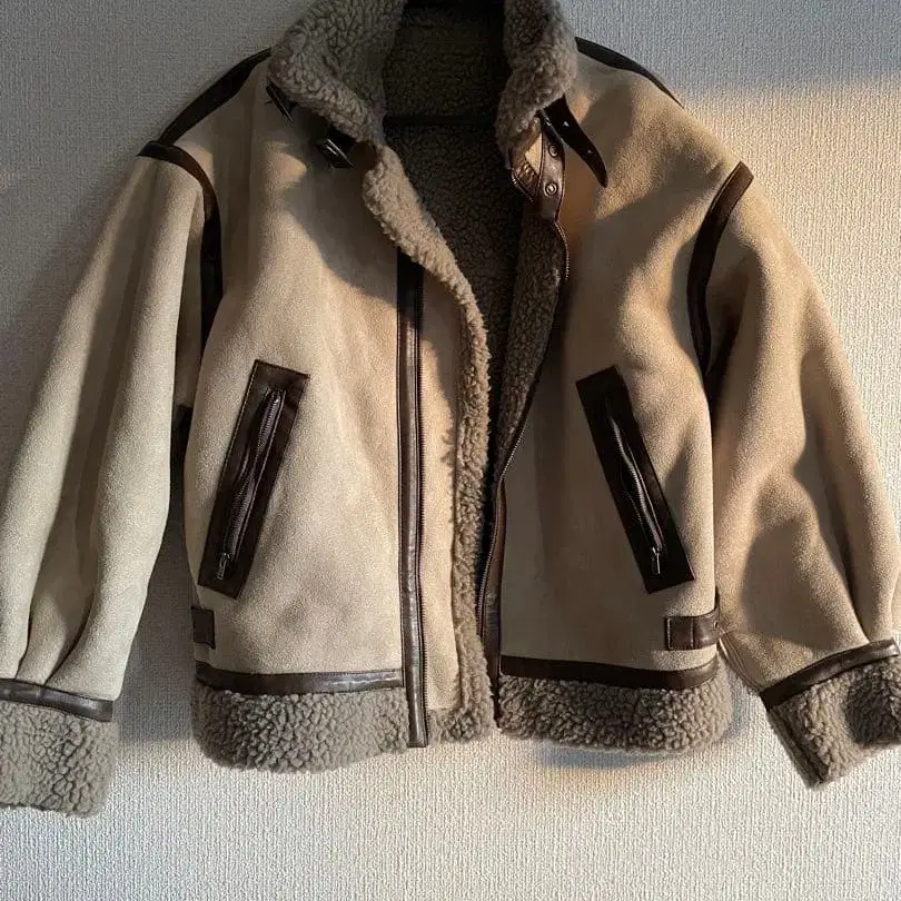 보아 소재의 베이지 자켓, 프론트 지퍼와 포켓 부착. - 브랜드: AZUL BY MOUSSY - 사이즈: M - 색상: 베이지 - 소재: 보아 소재 - 디자인: 프론트 지퍼, 포켓 부착 방문해 주셔서 감사합니다. 사이즈 - M