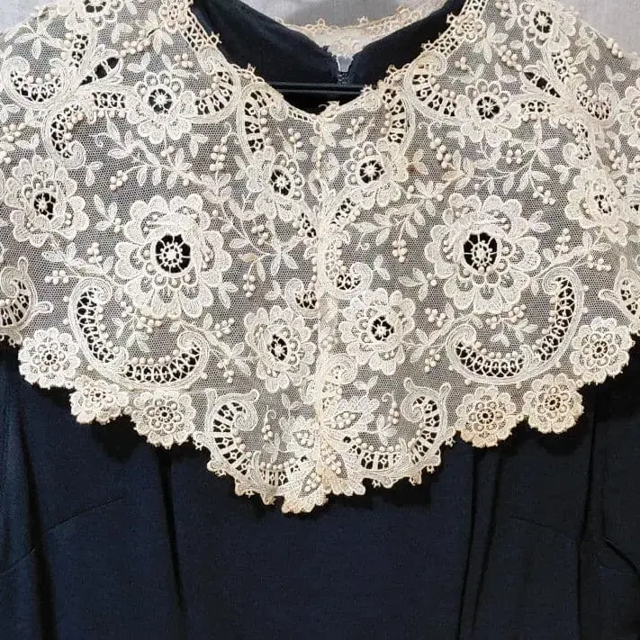 빈티지 물건을 매우 좋아해서 30년 이상 전에 메지로의 앤티크 숍에서 구매한 럭셔리한 레이스 탈부착 카라입니다. 영국 빅토리아 시대의 물건이라는 설명이었습니다. 사진에서는 블랙 원피스에 맞춰 보았으니 참고해 주세요. 100년 이상 전의 물건이므로 상응하는 데미지와 변색이 있지만, 손으로 만든 아름다움은 훌륭합니다. 전체 46cm 폭 20cm 상당한 크기가 있어서 플레인한 원피스도 이것만으로 럭셔리한 포멀 의상으로 완성됩니다. 일부러 세탁하지 않고 현재 상태 그대로 전달합니다. 빈티지에 이해가 있는 분, 잘 부탁드립니다.
