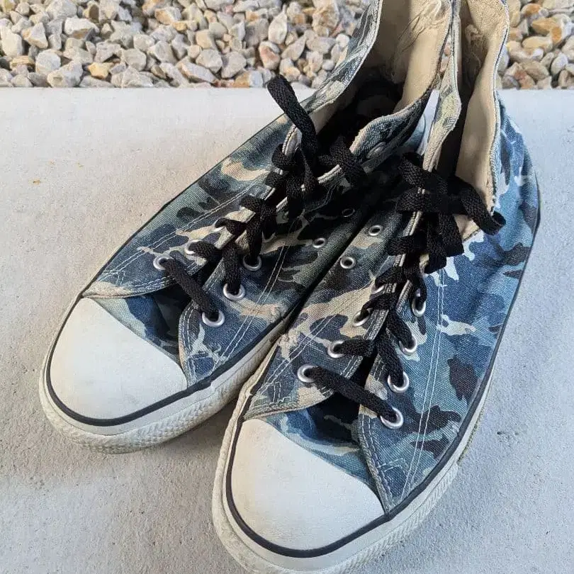 카모플라쥬 CONVERSE 올스타 하이컷 - 브랜드: CONVERSE - 디자인: 카모플라쥬 - 색상: 블루 계열 - 스타일: 하이컷 - 제조국: 미국 카모플라주 올스타입니다. MADE IN USA이지만 낡았습니다.