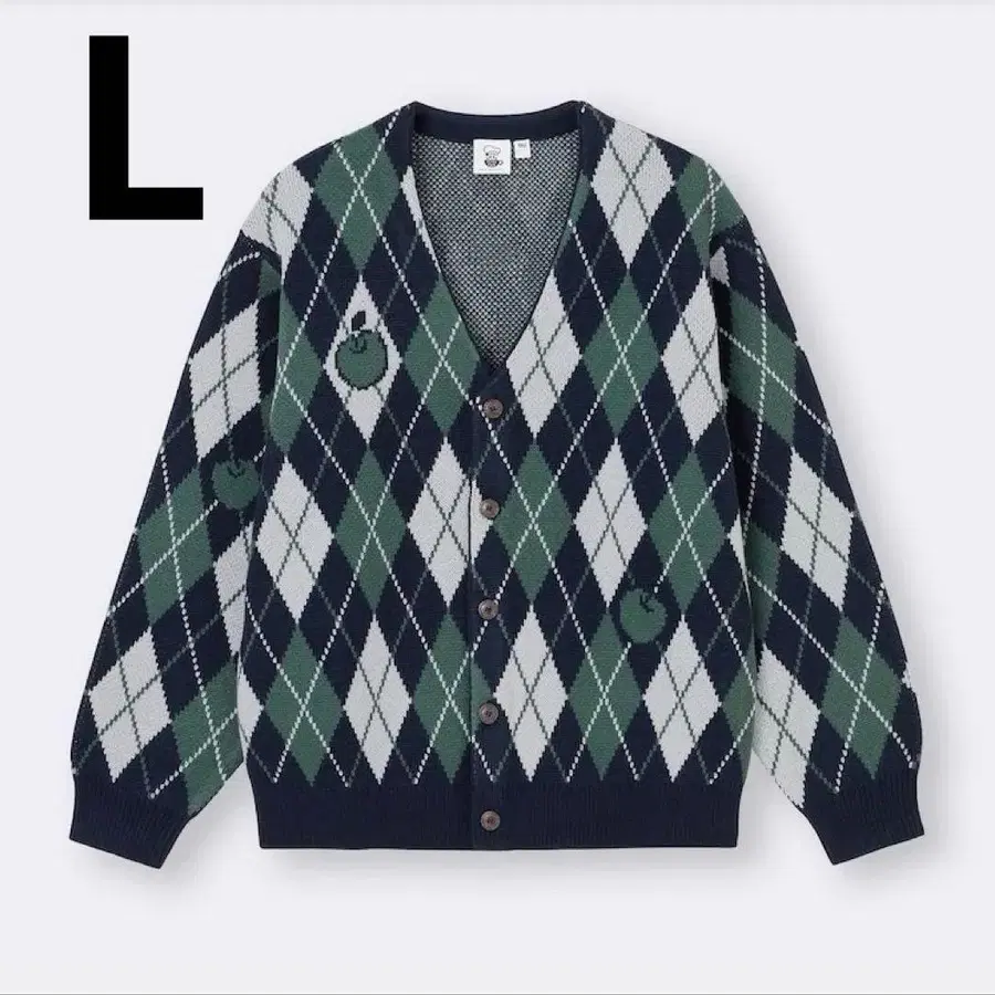 아가일 패턴의 버튼이 달린 가디건, 자수 디자인이 특징입니다.