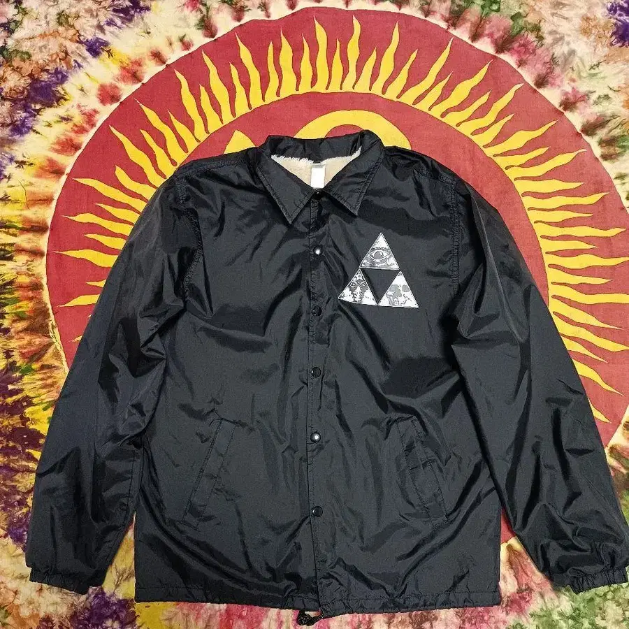 삼각형 그래픽이 특징인 블랙 나일론 자켓. - 색상: 블랙 - 디자인: 삼각형 그래픽 프린트 - 브랜드: United Sports Headline - 소재: 나일론 - 스타일: 버튼 업 자켓 방문해 주셔서 감사합니다.