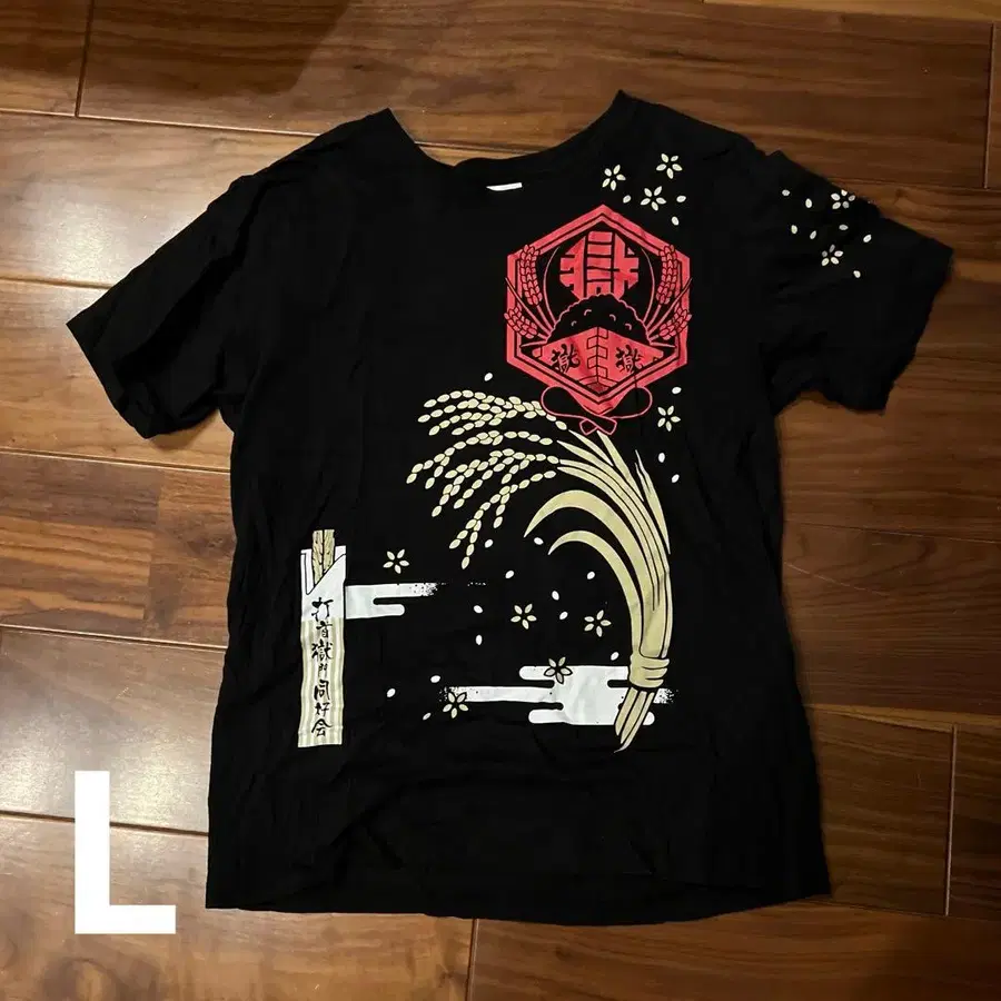 앞면에 빨간색 심볼과 골드 컬러의 벼 이삭이 특징인 T셔츠. - 디자인: 앞면에 빨간색 심볼과 골드 컬러의 벼 이삭 디자인 - 뒷면 디자인: 뒷면에 큰 흰색 한자 디자인 - 브랜드: LIFEMAX - 사이즈: L 방문해 주셔서 감사합니다. 벼 이삭