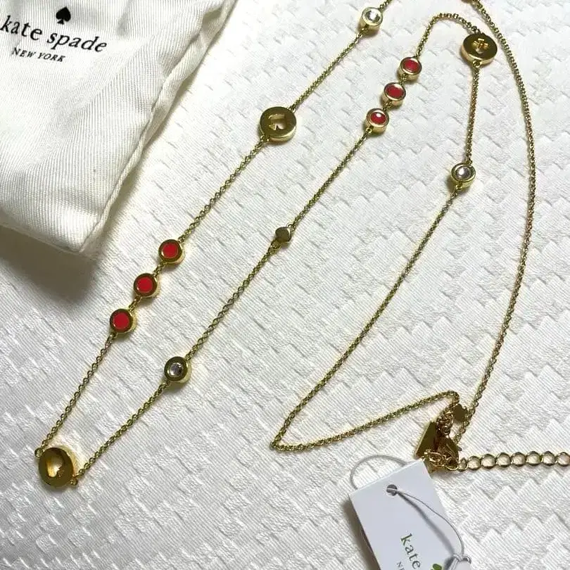 골드 롱 목걸이, 빨간색 비쥬가 특징입니다. - 브랜드: kate spade - 색상: 골드, 빨간색 - 스타일: 롱 목걸이 - 소재: 금속 방문해 주셔서 감사합니다. 택 포함 미사용 새상품 구매 후 한 번도 사용하지 않았습니다. 색상 - 골드 계열 색상 - 레드 계열 색상 - 골드 계열 흠집, 변색 등 - 없음 파우치 포함