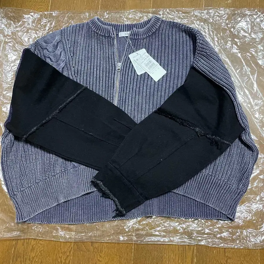 케이블 짜임 디자인에 소매가 다른 소재로 된 w 집업 니트 아우터입니다.