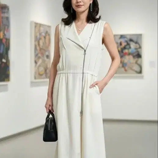 실크 100% 아이보리 슬리브리스 올인원, 집업 디자인으로 스타일리시합니다. 1번째 이미지는 착용 이미지입니다 ♪ - 색상: 아이보리 - 디자인: 집업, 포켓 부착 - 스타일: 슬리브리스, 허리밴딩 - 백 디자인: 심플한 백 - 소재: 경량, 통기성 있는 원단 방문해 주셔서 감사합니다. 가슴 너비/허리/기장 가슴 너비 - 43cm 허리 - 35cm 기장 - 97cm 색상 - 베이지 계열 얼룩, 찢김, 냄새 등 - 없음