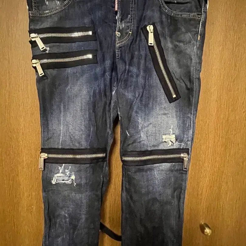 지퍼 달린 포켓이 특징인 데미지 데님.