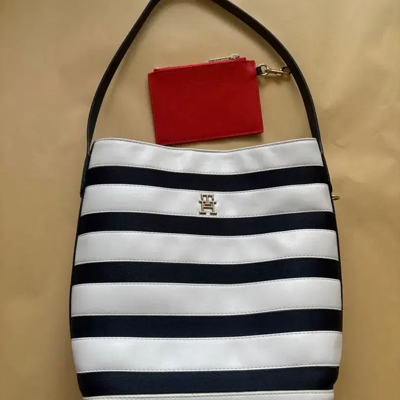 스트라이프 숄더백과 빨간색 파우치