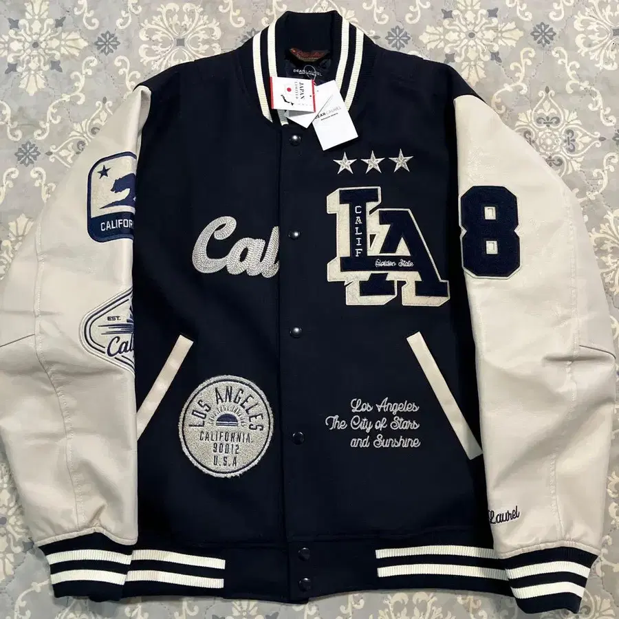 인기 있는 DERL LAUREL 2025 캘리포니아와 로스앤젤레스 자수가 들어간 네이비와 화이트 색상의 바시티 자켓.