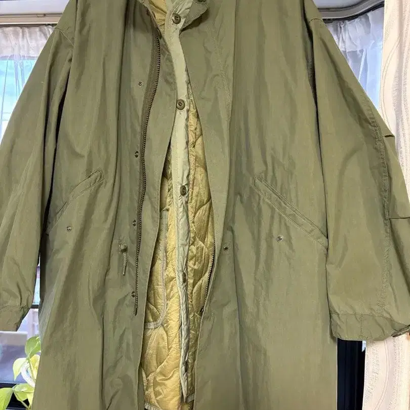 올리브 그린 퀼팅 모즈 코트, 프론트 버튼 개폐, 양쪽 사이드 포켓 포함.