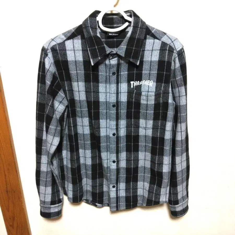 자동 번역되었어요. 원문보기THRASHER의 그레이와 블랙 체크 무늬 울 셔츠. 트레셔 로고 자수 포함
