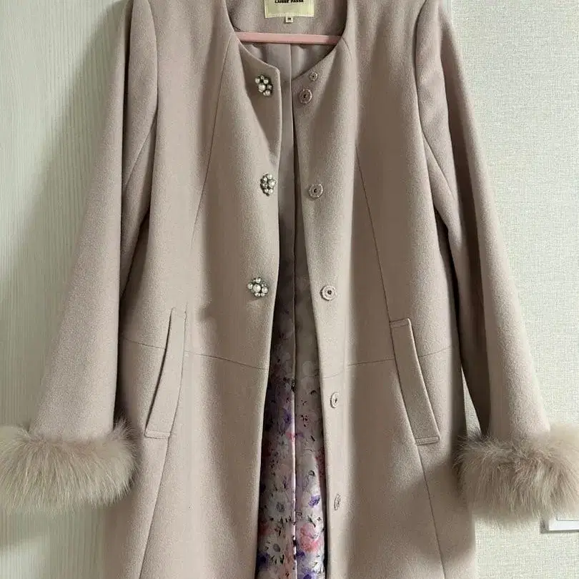 플라워 프린트 안감과 퍼가 달린 소매가 귀여운 핑크색 롱 코트입니다!