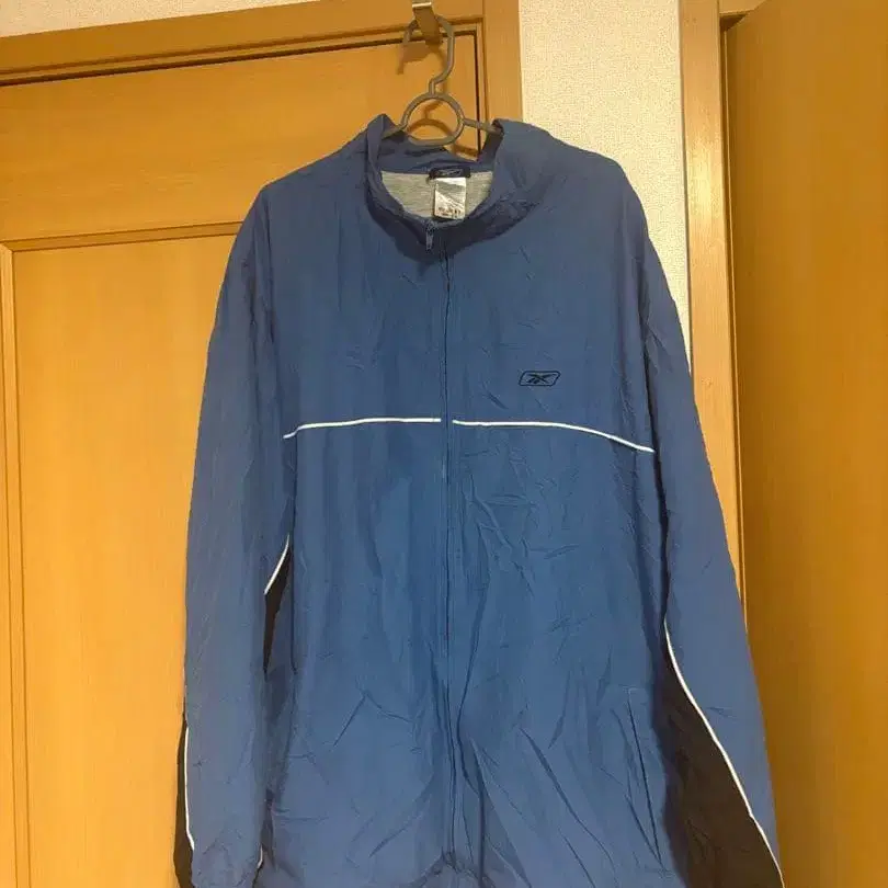 나일론 소재의 파란색 집업 자켓입니다. 소매는 밴딩 처리되어 쾌적한 핏감을 제공합니다.