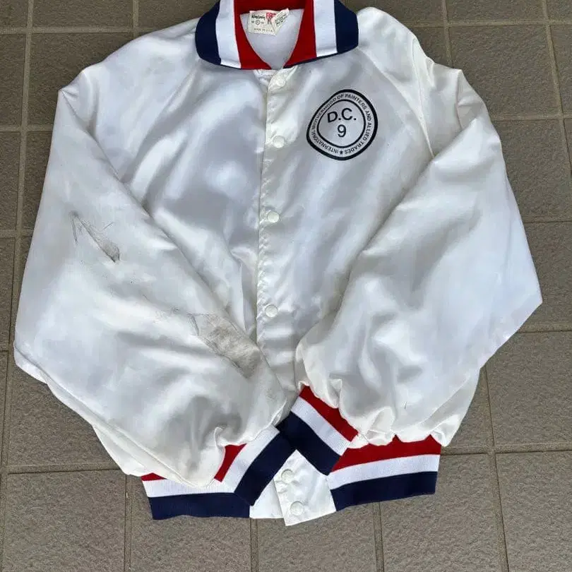 자동 번역되었어요. 원문보기새틴 소재의 화이트 자켓, D.C. 9 로고와 미국 국기를 가진 독수리 자수가 특징입니다.